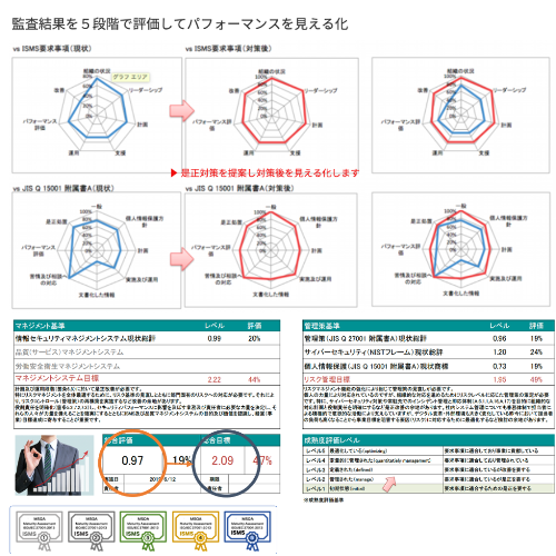 フィットアンドギャップ分析表(監査チェックシート)により現状を分析し、5段階で評価します。評価結果でチャートが作成され、強み弱み(ぜい弱性)が一目瞭然です。文書化されていても運用されていない、有効に機能していない場合も視覚化され、是正改善のポイントが明確になります。